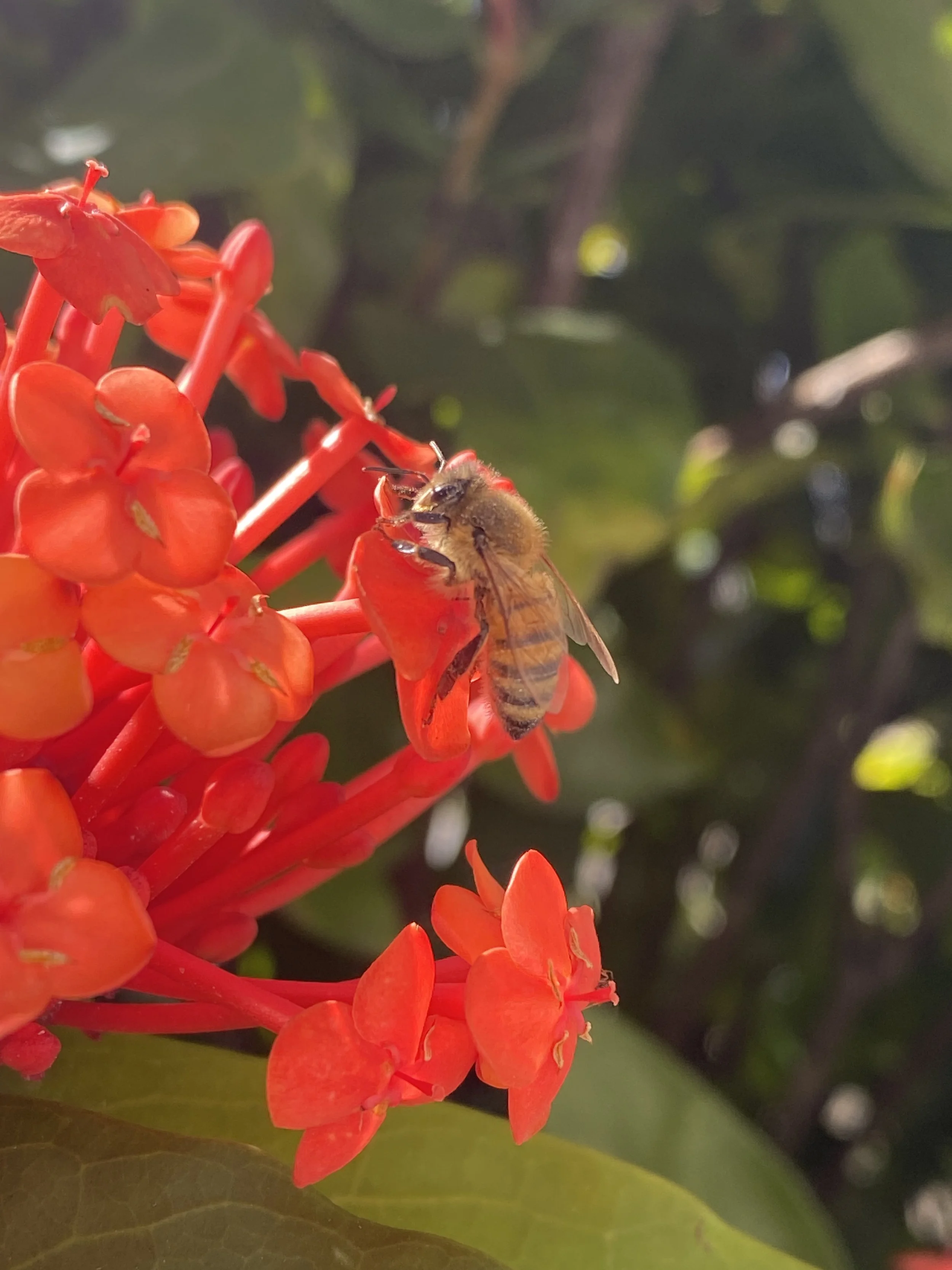 On a few occasions, bees will get lost in my apartment. I’m never too busy to stop and help them out. The pouring stops when I’m called to feed a bee in need. On my patio grows a giant flowering tree. Its red plumes never seem to be out of season. I’ll bring the bees to this tree and watch them delight in the nectar of the red flowers. When they fly off, I head back and continue tending to the candles.